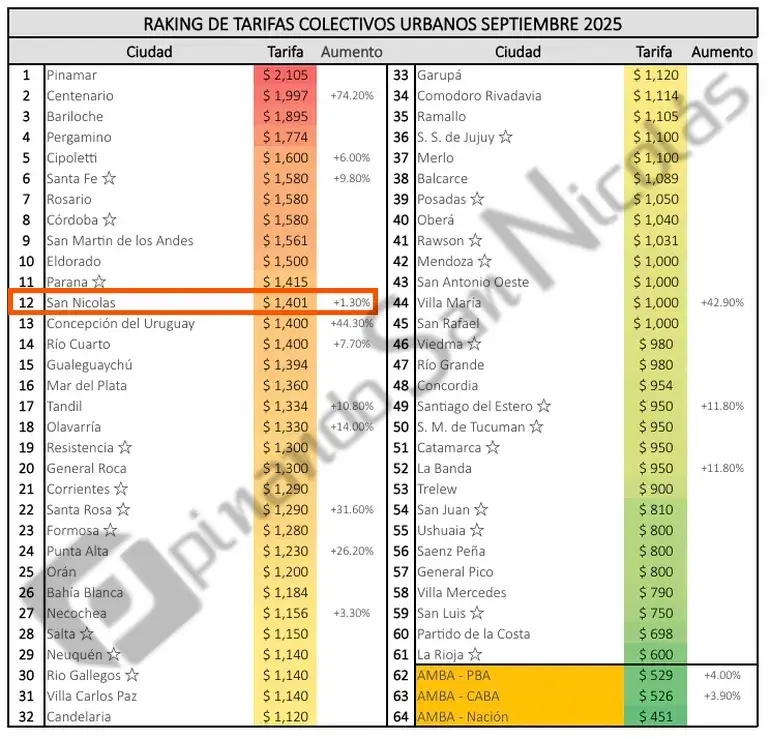 San Nicolás se ubica en el puesto 12 del ranking nacional de tarifas de transporte urbano con un boleto de $1.401, según el informe de septiembre de la Asociación Argentina de Empresarios del Transporte Automotor (AAETA). La cifra refleja una suba del 1,30% en el último mes, consolidando a la ciudad entre las doce localidades con los costos más altos para viajar en colectivo.