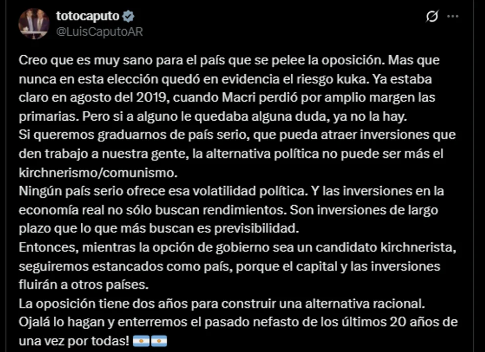 El ministro de Economía, Luis Caputo, afirmó que para que Argentina pueda consolidarse como un país serio y atractivo para la inversión, el kirchnerismo no puede formar parte del escenario político. “Si queremos graduarnos de país serio, que pueda atraer inversiones que den trabajo a nuestra gente, la alternativa política no puede ser más el kirchnerismo/comunismo”, sostuvo.