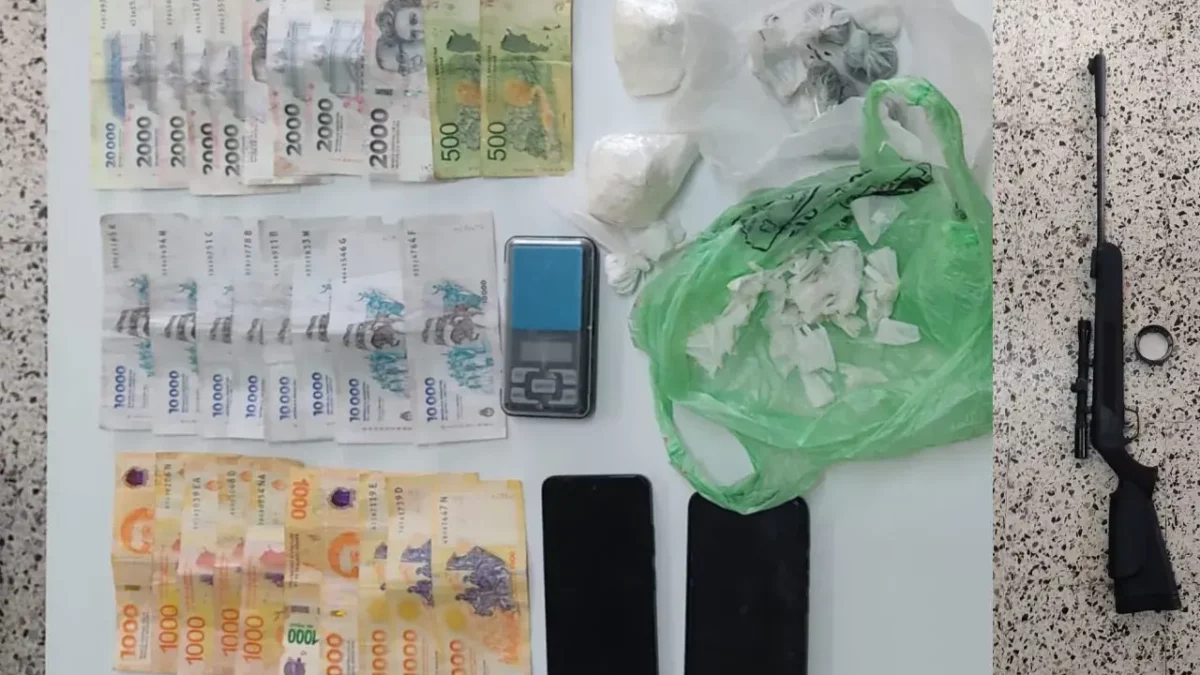 En el primer objetivo, ubicado en Firpo al 1600, el resultado fue positivo: se procedió al secuestro de una arma de fuego tipo “tumbera”, un cartucho calibre 12, una cuchilla de fabricación casera, una caja de balines, un aire comprimido calibre 5.5 mm, dos teléfonos celulares Motorola y Noblex, un bastón metálico215 gramos de cocaína8 gramos de marihuana, recortes de nylon, una balanza de precisión y $127.000 en efectivo.
