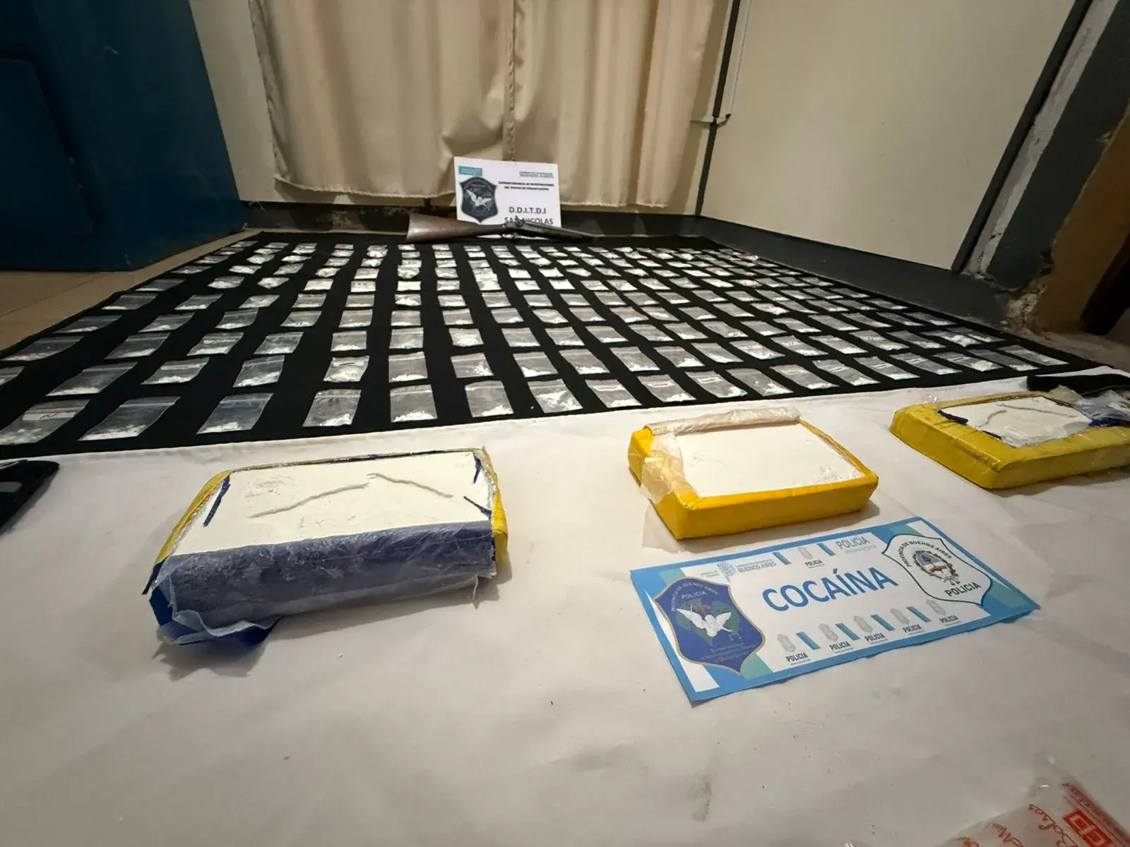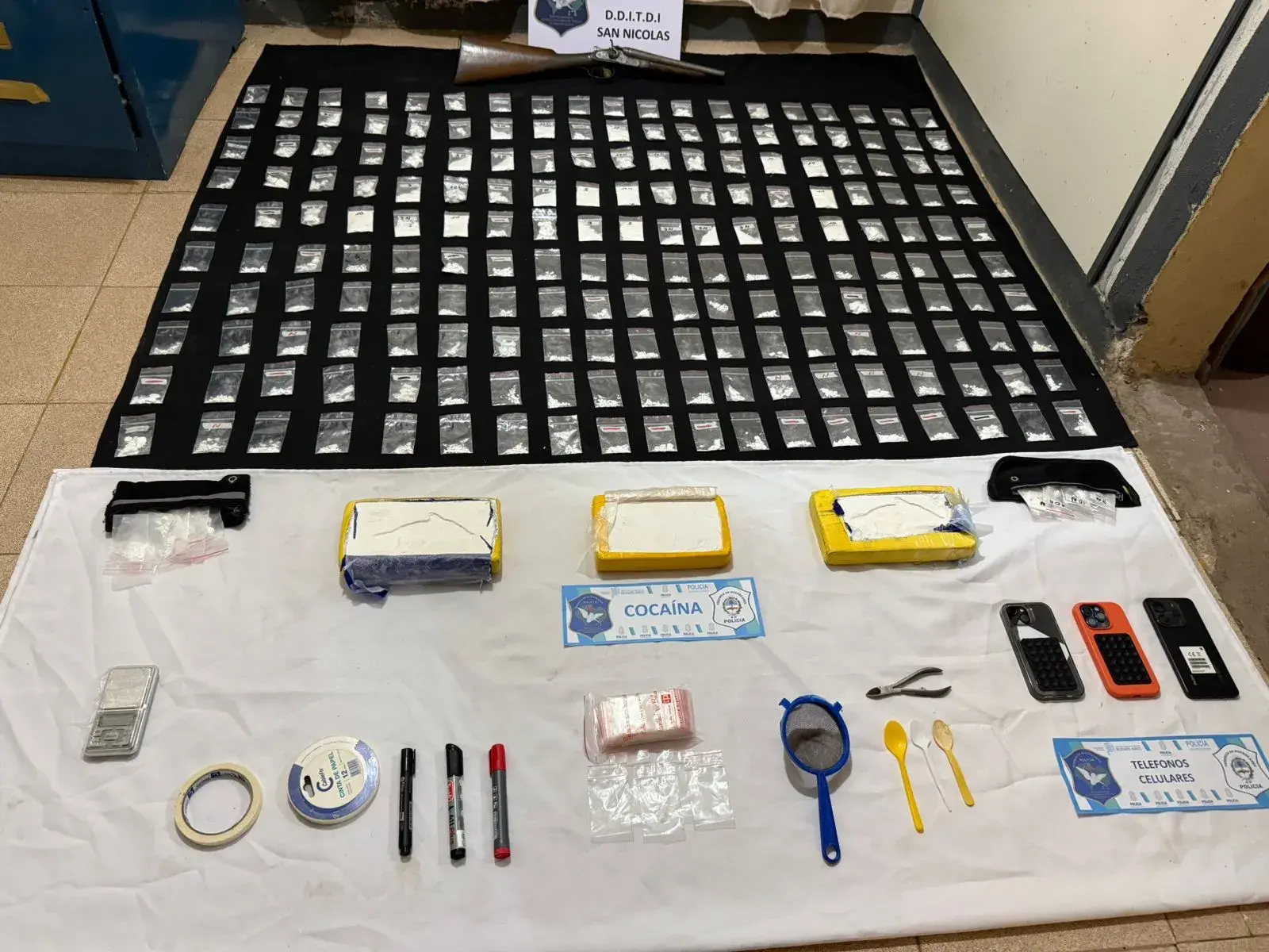 Como resultado de las minuciosas tareas investigativas, la Dra. Marcantonio solicitó al Juzgado de Garantías la orden de allanamiento, que se llevó a cabo en Avenida Roca al 500, barrio privado Urbano, donde se logró la aprehensión del investigado y el secuestro de alrededor de 200 bolsas ziploc con cocaína fraccionada, tres ladrillos de cocaína de máxima pureza, elementos de fraccionamiento, tres teléfonos celulares, una balanza de precisión, un arma de fuego recortada calibre 16, anotaciones de interés y una camioneta de alta gama.