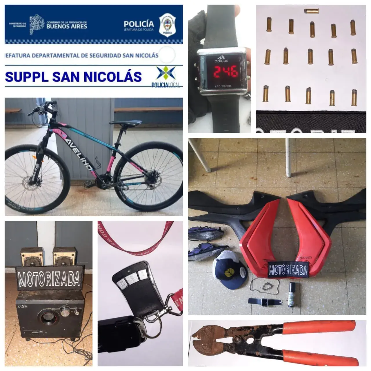 📲 Click AQUÍ Los agentes también incautaron un reloj pulsera, una tijera corta candados, un gas pimienta, tres parlantes negros de distintos tamaños, una gorra, una bicicleta rodado 29 marca Avelino, un juego de llaves de alarma, una cadena y una pulsera, objetos que quedaron incorporados a la causa.