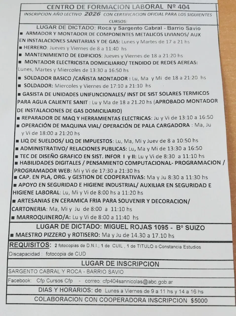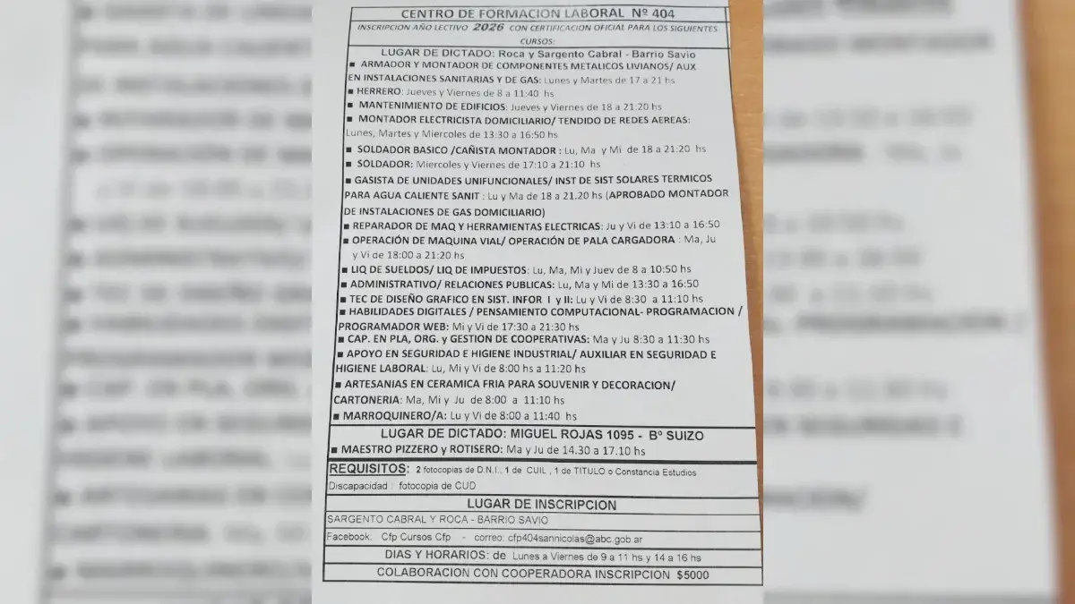 El Centro de Formación Laboral Nº 404 confirmó que ya iniciaron las inscripciones para el ciclo 2026 en su edificio de Roca y Sargento Cabral, en el barrio Savio. La institución renovó su propuesta educativa con capacitaciones oficiales enfocadas en construcción, mantenimiento, administración, tecnología, cocina y oficios artesanales. Todas son gratuitas y abiertas a la comunidad.