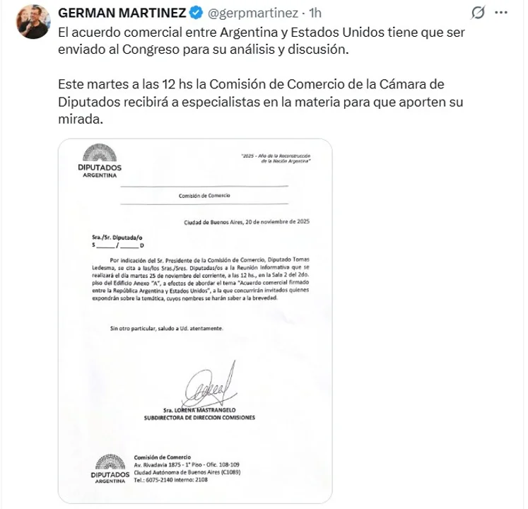 El presidente del bloque de Unión por la Patria, Germán Martínez, remarcó que el entendimiento “debe ser enviado al Congreso para su análisis y discusión”, y confirmó que durante la reunión se escuchará a especialistas que aportarán evaluaciones técnicas sobre el alcance del pacto.