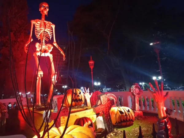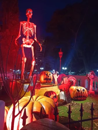 El sector intervenido había sido ambientado de forma particular para generar una estética de terror. Una máscara gigante del payaso IT había sido ubicada en la Bajada Belgrano, mientras que en la Plaza Mitre se había montado un espacio con tumbas, calabazas y esculturas de esqueletos, generando una escenografía que impactó a quienes circularon por ese punto.