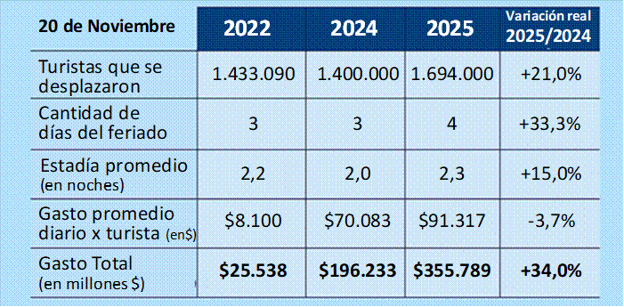 El feriado de cuatro días de noviembre permitió un aumento del 21% en el número de turistas que viajaron, con un crecimiento real del 34% en el gasto total frente al mismo período del año pasado. El clima y la agenda de actividades y eventos fueron determinantes en los buenos resultados.