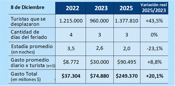 • De acuerdo con el relevamiento de la Confederación Argentina de la Mediana Empresa (CAME), durante el fin de semana largo por el Día de la Inmaculada Concepción se desplazaron 1.377.810 turistas por la Argentina, un 43,5% más que en el mismo feriado de 2023 (en 2024 no hubo feriado). La fecha volvió a consolidarse como uno de los momentos de movilidad turística previos al verano.