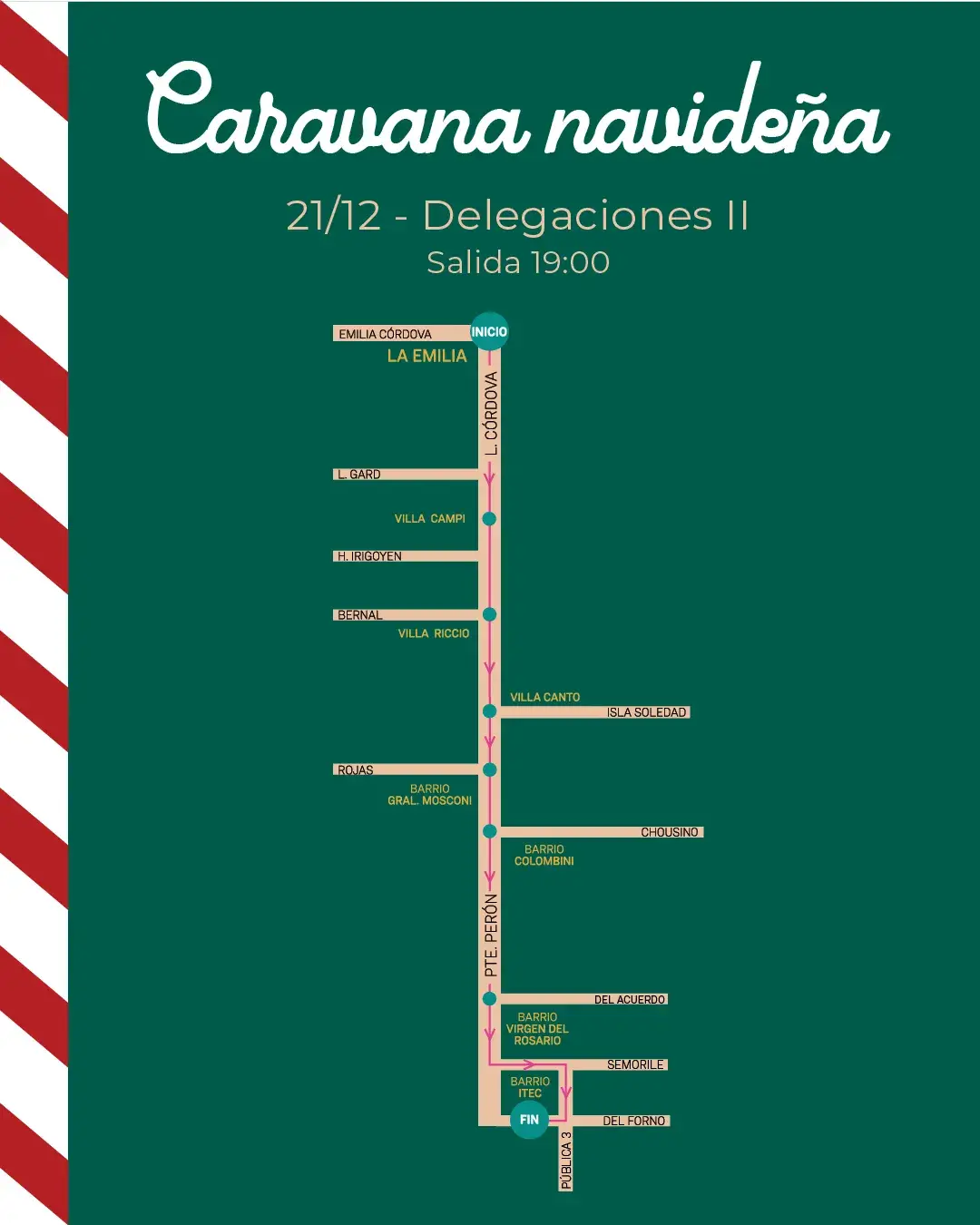 El itinerario dará inicio en La Emilia y concluirá en Barrio ITEC, atravesando diversos sectores de la ciudad. Durante el trayecto, vecinos y vecinas podrán acercarse para saludar a Papá Noel, compartir un momento especial en familia y dejar sus deseos navideños.