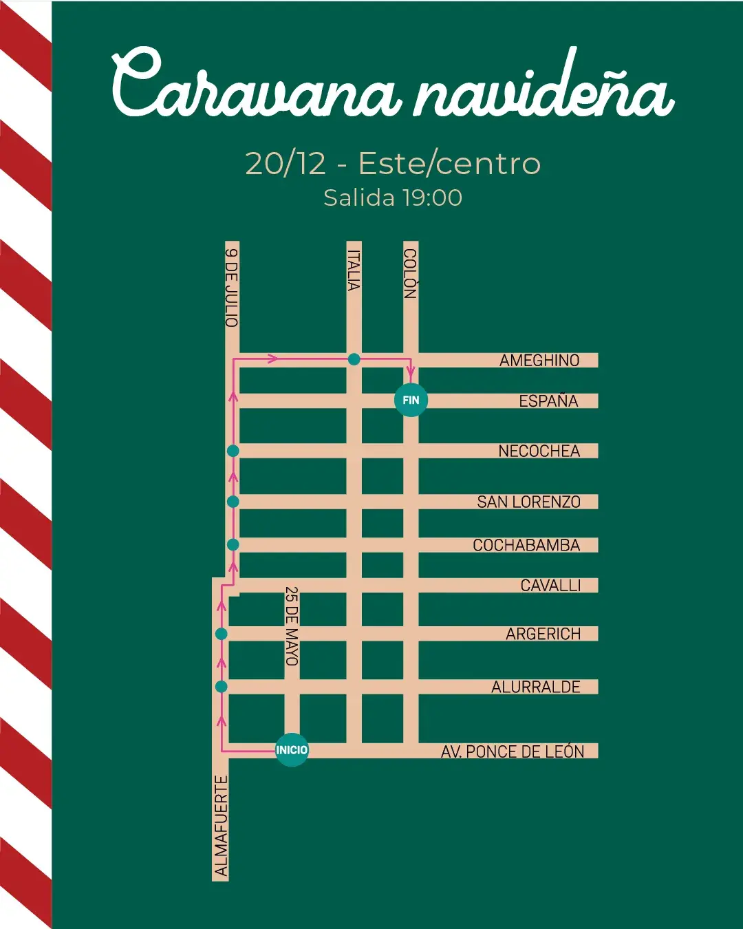 El recorrido comenzará en la intersección de Ponce de León y 25 de Mayo y finalizará en España y Colón, atravesando diferentes sectores de la ciudad. A lo largo del trayecto, los vecinos podrán acercarse para saludar a Papá Noel, compartir un momento en familia y dejar sus deseos.