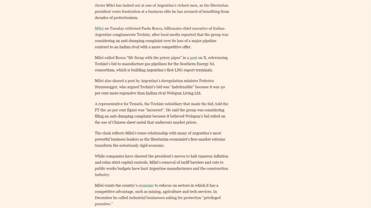 La tensión entre el presidente Javier Milei y Paolo Rocca, titular del Grupo Techint, traspasó el plano local y captó la atención de la prensa económica internacional, que interpretó el conflicto como una señal del malestar del Gobierno con sectores empresariales acusados de haberse beneficiado durante años del proteccionismo estatal.