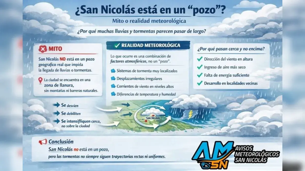 San Nicolás no está en un pozo. La explicación radica en que la atmósfera se comporta de manera dinámica y variable, y no todas las tormentas impactan del mismo modo en cada localidad.