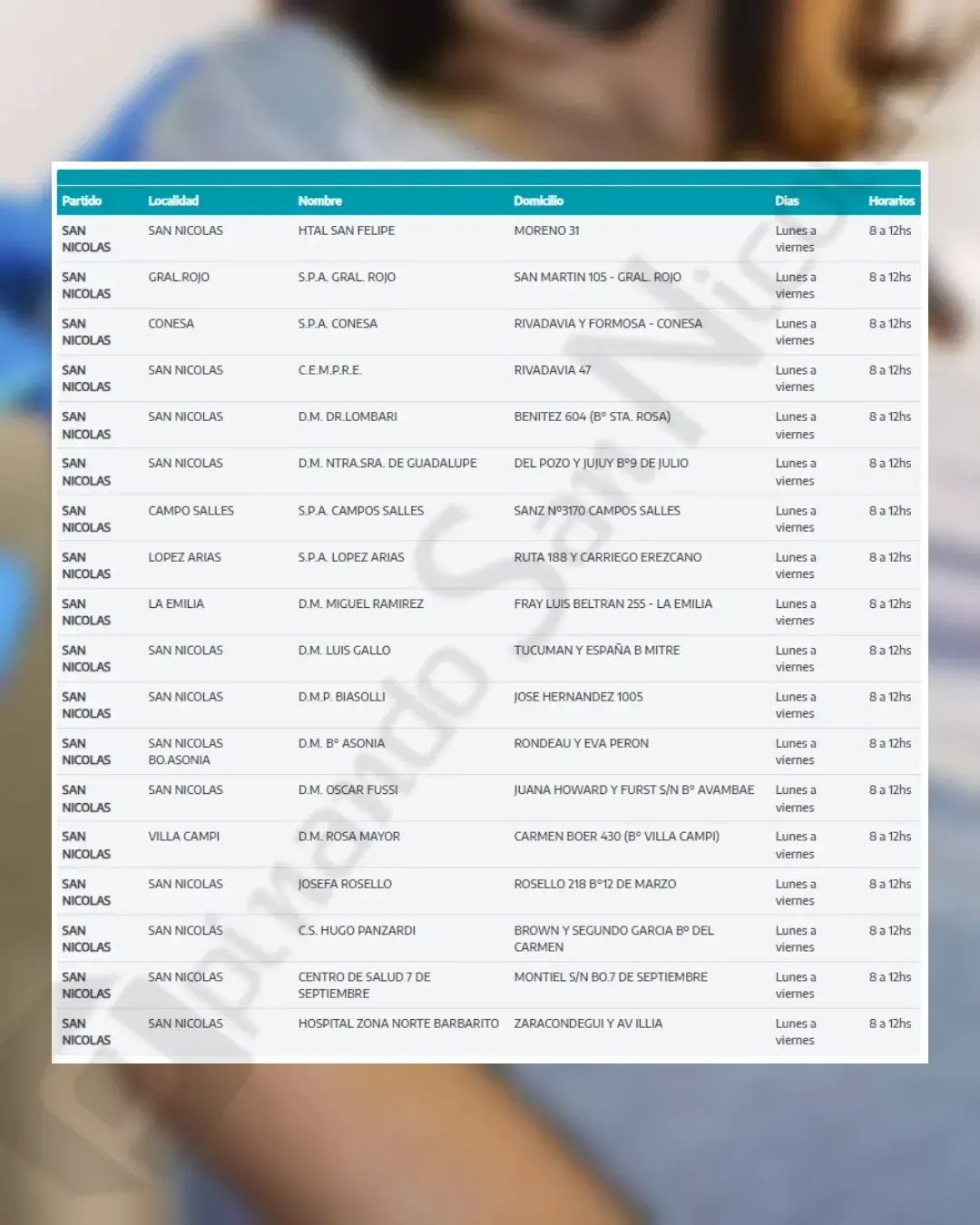 En el caso de San Nicolás, la vacuna se encuentra disponible en los centros de salud y vacunatorios que figuran en la imagen adjuntada, los cuales forman parte de la red sanitaria habilitada en toda la provincia.