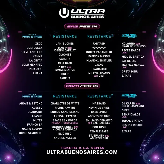 ULTRA Buenos Aires confirmó oficialmente los lineups diarios por escenario de su sexta edición, que se realizará el sábado 14 y domingo 15 de febrero de 2026 en el Parque de la Ciudad. El festival volverá a posicionarse como uno de los eventos electrónicos más importantes de la región, con una programación que combina figuras globales, referentes del circuito underground y una destacada presencia de artistas locales.
