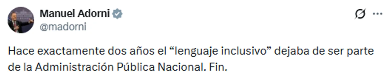 El vocero presidencial Manuel Adorni marcó en redes sociales el segundo aniversario de la decisión que excluyó el uso del llamado lenguaje inclusivo en la Administración Pública Nacional.