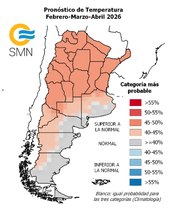 Es importante aclarar que este tipo de proyección no anticipa olas de calor extremas ni récords históricos, sino que describe una tendencia estadística. En términos concretos, señala que el promedio de las temperaturas del trimestre tiene más chances de ubicarse por encima del valor habitual para esta época del año.