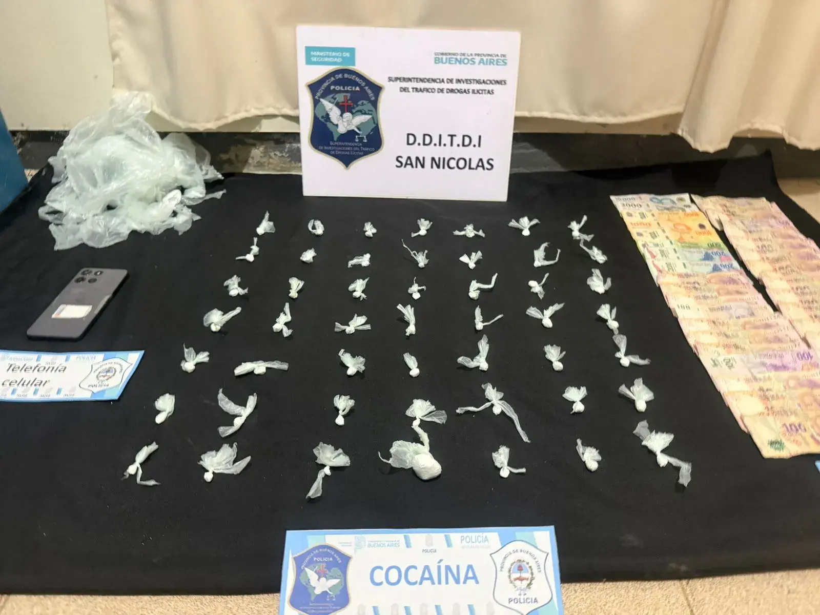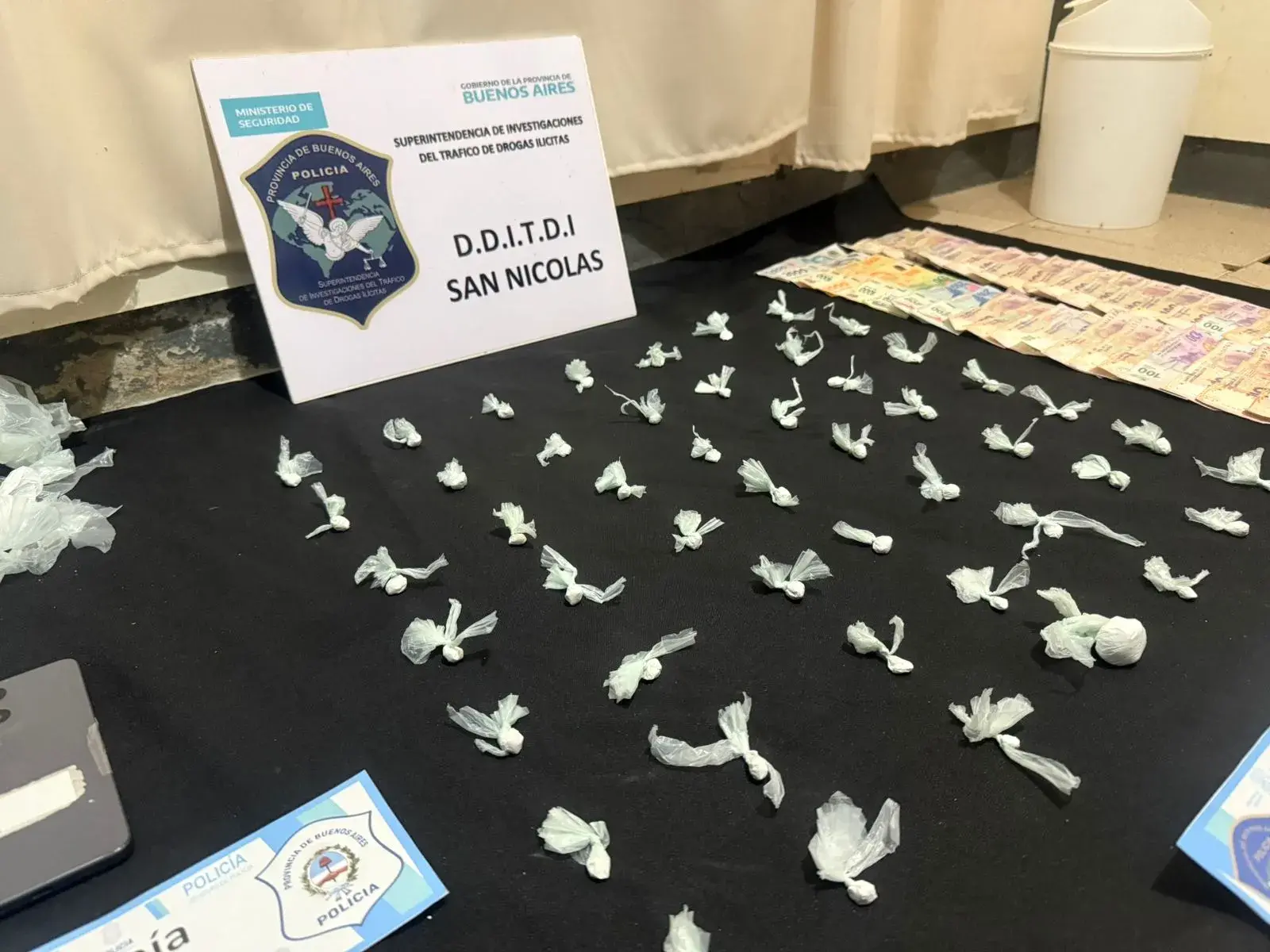 Como resultado de las minuciosas tareas investigativas, la Dra. Marcantonio solicitó al Juzgado de Garantías una orden de allanamiento, la cual se concretó en un domicilio ubicado en Pedro de Mendoza y Derqui, donde se logró el secuestro de una considerable cantidad de envoltorios de cocaína fraccionados listos para su venta, además de droga preparada para ser fraccionada, recortes de nylon, dinero en efectivo y un teléfono celular.