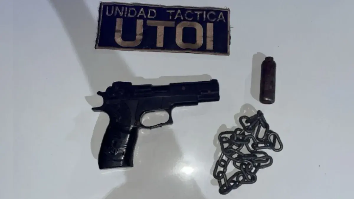 Durante el control, los efectivos secuestraron una réplica de arma de fuego de plástico color negro, similar a una pistola calibre 9 mm, sin numeración visible, además de una cadena metálica con punta cilíndrica de aproximadamente 20 centímetros.