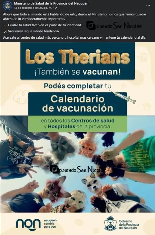 Una publicación del Ministerio de Salud de Neuquén sorprendió en redes sociales y abrió un intenso debate público. Bajo el lema “Los therians también se vacunan”, la cartera sanitaria buscó llegar a públicos jóvenes apelando a una tendencia digital poco habitual en campañas oficiales.