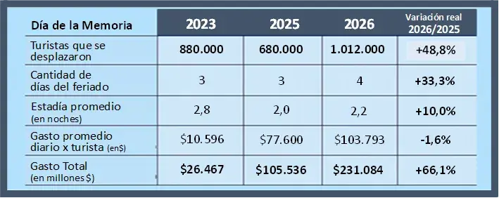 l El gasto promedio diario fue de $ 103.793, un 7% menor al gasto del feriado de Carnaval de febrero último. Esto se explica a partir de que los turistas eligieron destinos más cercanos y también porque entre los gastos recreativos no existió la oferta del Carnaval. En cambio, prevalecieron actividades culturales y conmemorativas por el 24 de marzo, casi todas de acceso gratuito. También fue un 1,6% menor al feriado de la Memoria del año pasado, comparado a precios reales.