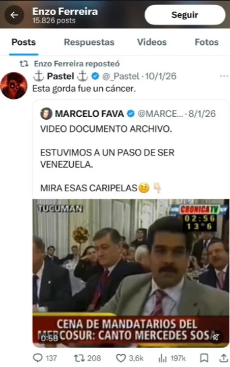 El repudio se originó a partir de mensajes difundidos en redes sociales donde el funcionario utilizó expresiones como “gorda comunista” y también compartió otra publicación que calificaba a la artista como “un cáncer”, lo que generó un amplio rechazo.