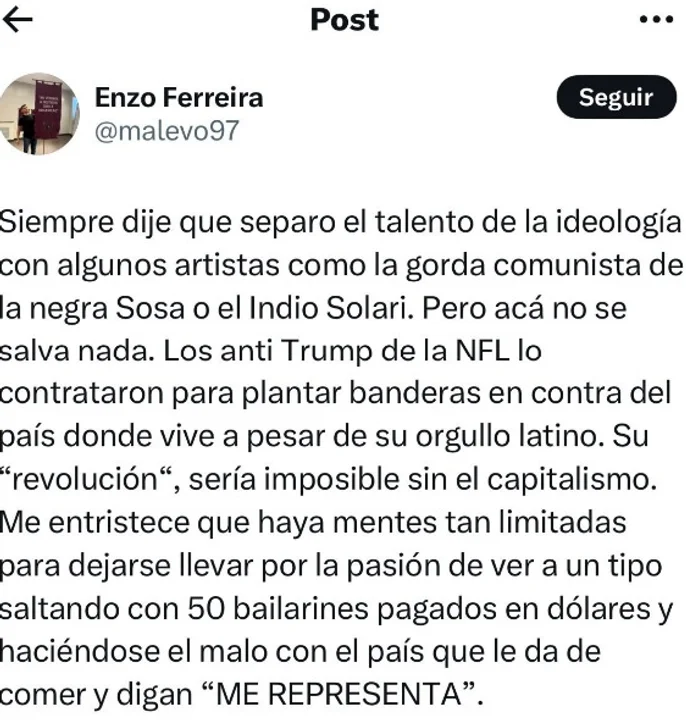 Un fuerte rechazo se generó en Tucumán luego de que el director de Radio Nacional Tucumán Mercedes Sosa, Enzo Ferreira, realizara publicaciones ofensivas contra la histórica cantautora, lo que motivó la reacción de su familia y organismos culturales.