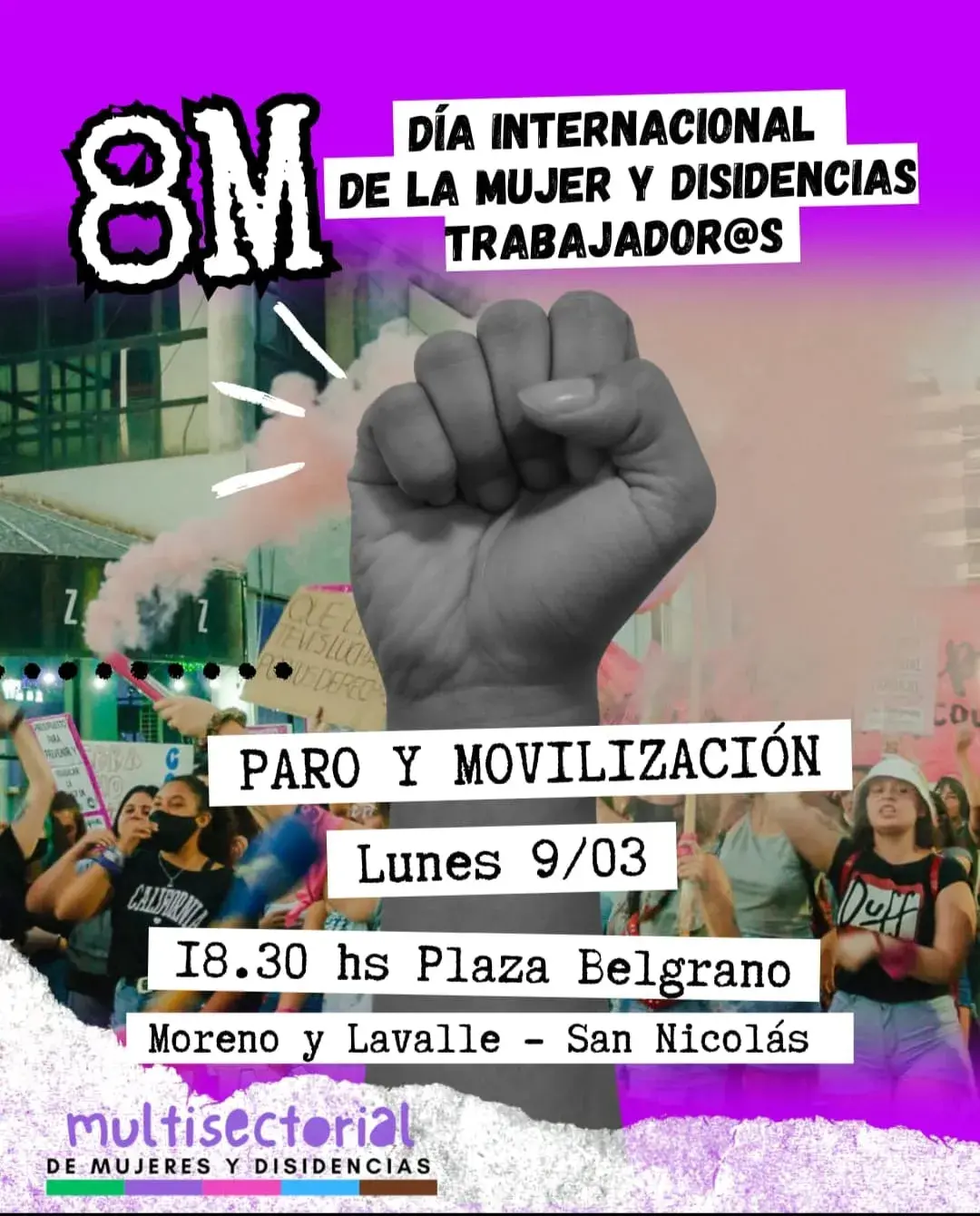 Organizaciones feministas, sociales, políticas y sindicales preparan una nueva jornada de protesta y visibilización en el marco del Día Internacional de la Mujer Trabajadora, con actividades que se replicarán en distintos puntos del país. En San Nicolás, la convocatoria local prevé una concentración a partir de las 18:30 en la Plaza Belgrano, en la intersección de Lavalle y Moreno, donde se espera la participación de vecinos y agrupaciones que acompañan los reclamos.