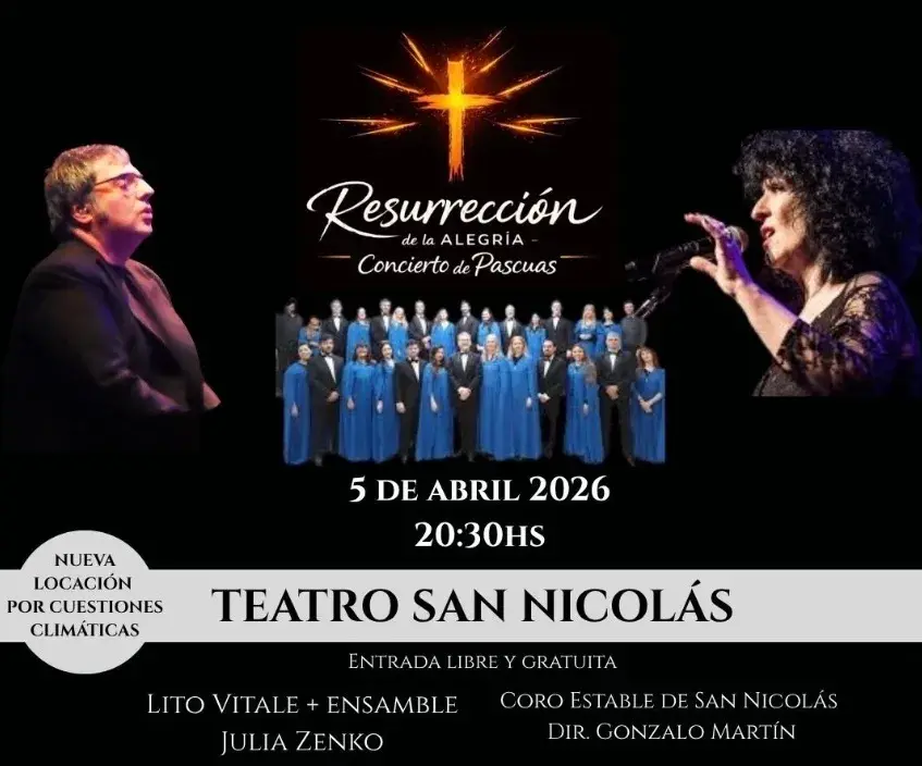 San Nicolás será escenario de una propuesta cultural y solidaria en el marco de Semana Santa, con un concierto que reunirá a reconocidos artistas en el Teatro local, en una iniciativa que busca combinar música, puesta escénica y un mensaje de encuentro colectivo inspirado en los valores de la Pascua.