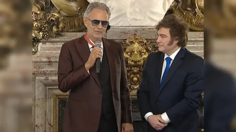 Milei recibió a Andrea Bocelli en Casa Rosada durante una visita protocolar del tenor italiano