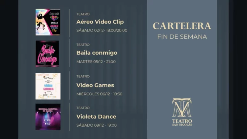 Durante los próximos días, la cartelera del Teatro San Nicolás se renueva con espectáculos a cargo de diferentes instituciones que cierran el año con…