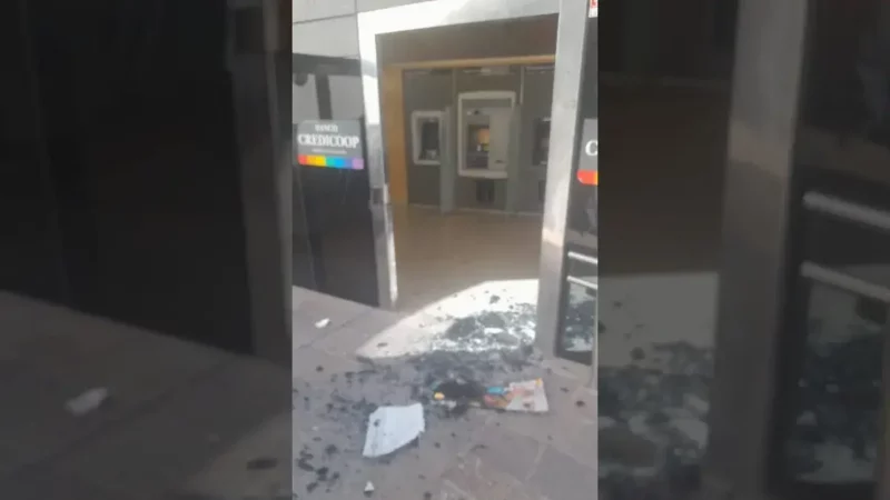 Incidente en banco Credicoop: daños en la puerta de acceso a cajeros automáticos